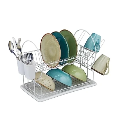 For washing up: Let your crockery and cutlery dry in this dish drainer after doing the dishes Basics: White drying rack made of iron and plastic - HWD: approx. 33.5 x 51 x 23.5 cm Clever: The crockery holder has 2 levels for plates and more - Hang on cutlery basket and mug holder Drip tray: Drainer with drip tray to collect excess water - Prevents water marks on your countertop Functional: Metal dish rack with non-slip feet - Stable - Practical accessory for washing dishes