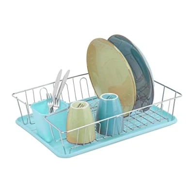 Kitchen aid: Drying rack for plates, mugs and cutlery - Leave washing up to dry with ease Dish rack: Sink drainer made from durable iron - Fits up to 11 plates, 10 glasses or 8 mugs Drip tray: Blue tray made from easy-clean plastic - No water on countertops Cutlery holder: With removable holder for cutlery - Inner size H x W x D approx. 9.5 x 8.5 x 8.5 cm Details: Compact dish drainer H x W x D: approx. 11.5 x 43 x 34 cm - Perfect for a single household
