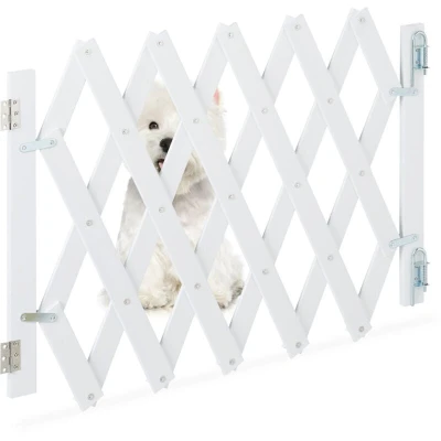 AmazonSafety: barrier as protection for dogs in the home - practical design without tripping edge Practical: extendable door grille with flexible width - for narrow and wide doors as well as stairs Details: white stair gate made of robust bamboo. Width: approx. 34.5 - 108.5 cm. Height: approx. 47.5-60 cm Drill installation: attach dog barrier to the wall easily and quickly with the included material Barrier: Use the scissor grille to deny your four-legged friend access to selected rooms