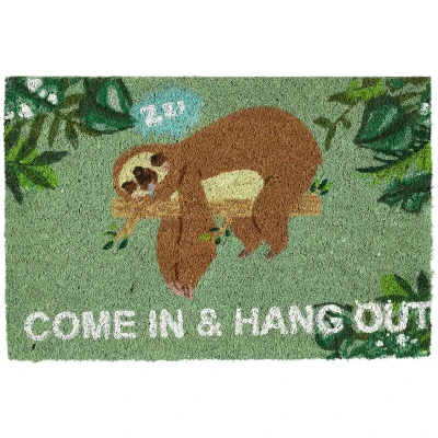 AmazonWith text: Cute dirt-trapping mat with relaxed sloth and print Come In And Hang Out Non-slip: Entrance mat with PVC-coated underside - foot scraper sticks firmly to the floor Universal: Doormat for indoors and outdoors - Practical decorative element for home and garden Robust: Shoe scraper made of resistant coconut fibres - Natural, environment friendly, weatherproof Dirt trap: No dirt or shoe prints in the home - Simply tap off the rug to clean.