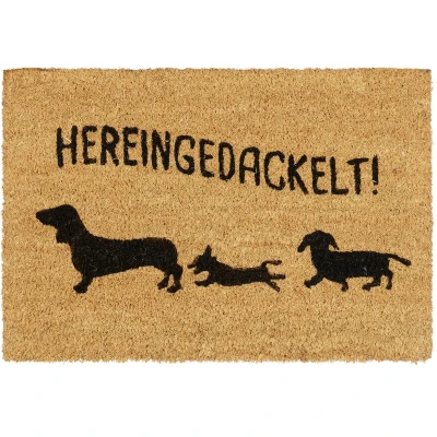 With this original doormat with dachshund motif and saying, you'll put a smile on your guests' faces before they even open the door. But the doormat scores not only visually. Thanks to the natural coconut fibres, the door mat is robust and durable. The environmentally friendly raw material is characterised by weatherproof properties and gives the doormat a natural look. The underside is made of non-slip PVC so that the mat stays in its place. Note: Coconut is a natural product, which is why there may be slight variations in the structure and colour of the fibres. Coir doormat in detail - Dimensions H x W x D: approx. 1.5 x 60 x 40 cm - Weight: approx. 1.5 kg - Material: Coconut fibre, PVC - Colour: Natural, black Non-slip door mat for the home - Suitable for indoors and outdoors - Keeps dirt away from the home - Coir is robust and waterproof - Anti-slip coating made of PVC - Warm welcome for guests - Cool gift idea for dog owners
