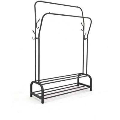 AmazonCrease-free: jackets, shirts and blouses can be hung on 2 rails without creasing. Practical: black coat rack for tidier rooms – stopper balls prevent sliding off Wardrobe: 2 sturdy shelves each hold up to 40 kg for shoes, boxes or bags Hooks: 8 side hooks for hats, bags and other accessories Details: Iron & plastic - Dimensions of coat rack H x W x D: approx. 146 x 110 x 33 cm