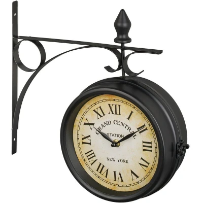 General description Enhance the charm of your home with this elegant vintage-inspired double-sided wall clock, designed to evoke the timeless appeal of iconic train station clocks, reminiscent of the Grand Central Terminal in New York. This grey decorative clock is perfect for living rooms, bedrooms, and study rooms, featuring a silent clockwork that ensures a peaceful and undisturbed environment. Technical specifications Overall dimensions (H x W x D): approx. 33 x 34 x 10 cm Clock diameter: approx. 20 cm Weight: approx. 1 kg Material: Iron, glass Colour: Black Installation Easy wall mounting (mounting material not included) Usage Battery operated with 2x AA batteries (not included) Double-sided analogue display allows viewing of two different times from any angle Other information Includes 1x hanging clock Decorative items are not included