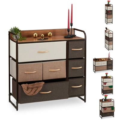 AmazonMixed materials: Polyester compartments, steel frame with MDF top - Chic combination of brown tone Design C: 7 Fabric compartments - H x W x D: app. 79 x 80 x 31.5 cm - Weighs app. 10.6 kg Flexible: Suitable for any room - For bathroom, hallway, bedroom and living room With shelf: For alarm clock, tissues and more next to your bed - Key shelf for hallway For storage: Drawers for clothes, accessories, towels and more