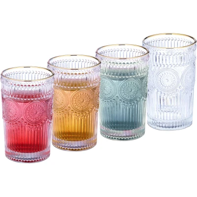 General description The Relaxdays Drinking Glasses Set of 4 features a vintage design that adds a touch of elegance to any table setting. These glasses are perfect for enjoying cocktails, as well as everyday drinks like water and lemonade. The structured surface ensures a comfortable grip, making them suitable for both casual and festive occasions. Technical specifications Dimensions (H x D): approx. 13 x 8 cm Volume: approx. 400 ml each Weight: approx. 340 g each Material: Glass Colour: Transparent with gold rim and pattern Other information Dishwasher safe Included in delivery: 4 drinking glasses (decorative items not included)