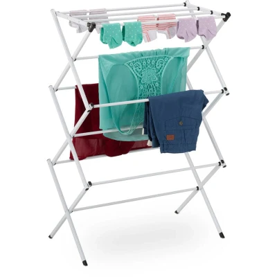 Drying your laundry after washing often takes up a lot of space. This foldable drying rack offers a space-saving solution to that problem. You can easily hang up tops, trousers, or underwear on 6 levels with a total of 11 bars. The different heights ensure optimal space utilization and good ventilation. When not in use, the clothes airer can be folded flat and stored under the bed, for example. Laundry Rack in Detail - Dimensions H x W x D: approx. 105 x 73 x 37 cm - Folded H x W x D: approx. 10 x 73 x 52 cm - Load capacity: max. 25 kg - Weight: approx. 2.1 kg - Material: Steel, plastic - Available in various colours Space-Saving Folding Airer - Ideal for drying and airing tops, trousers, and more - 11 rods across 6 levels provide ample space - Folds up easily for storage - Especially practical for small spaces or camping - Sleek design with rods made from coated metal
