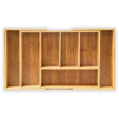 ManoManoGeneral description This bamboo cutlery tray is the perfect solution for organizing your kitchen drawer. It features an adjustable design that allows for 5, 6, or 7 compartments, providing ample space for spoons, forks, knives, and other kitchen utensils. Made from sturdy bamboo, this tray is not only sustainable but also robust, moisture-resistant, and safe for your knives. Technical specifications Total size pushed together: 5 x 37 x 28 cm Size fully opened: approx 5 x 48.5 x 28 cm Weight: approx 1.1 kg Material: Bamboo Colour: Natural brown Usage Ideal for organizing cutlery, crafts, jewellery, and more. Helps keep your belongings orderly. Easy to clean. Other information Decorative items shown in product pictures are not included.