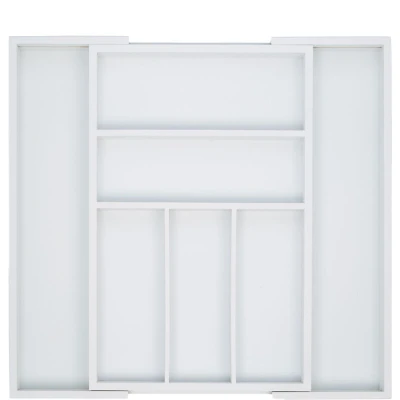 General description This bamboo cutlery organiser can be individually adjusted thanks to a pull-out function, making it easy to fit into any standard drawer. In its smallest width, the cutlery rack features 5 oblong compartments that provide ample space for knives, forks, spoons, and cake cutlery. By pulling the tray out from the sides, you can access two additional compartments for storing other kitchen gadgets such as whisks and wooden spoons. This drawer insert is ideal for sorting and organising your kitchen utensils. Technical specifications Regular dimensions (H x W x D): approx. 5 x 30 x 46 cm Fully pulled out dimensions (H x W x D): approx. 5 x 48 x 46 cm Material: bamboo, MDF floor Weight: approx. 1.5 kg Colour: white Other information Adjustable size Oblong silverware compartments Adjustable to 5, 6, or 7 compartments Included in delivery: 1 x Cutlery Tray (decorative items shown in product photos are not included)