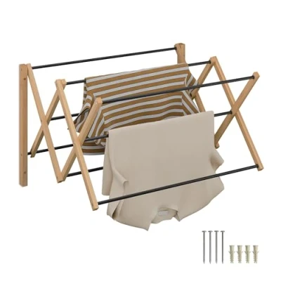 General description This wall-mounted drying rack is perfect for small flats. Its accordion design allows it to be pulled out when needed and folded flat when not in use. You can easily hang tops, towels, or underwear on the 8 rods, while the staggered arrangement of the rods ensures optimal air circulation. The laundry drying rack features a decorative design made of natural bamboo combined with matte metal. Technical specifications Dimensions (H x W x D): 45 x 71.5 x 59 cm Depth when folded: approx. 9 cm Load capacity: max. 10 kg Weight: approx. 1.6 kg Material: iron, bamboo Installation Includes mounting materials for easy installation on the wall Usage Ideal for drying tops, towels, and underwear Space-saving design when not in use