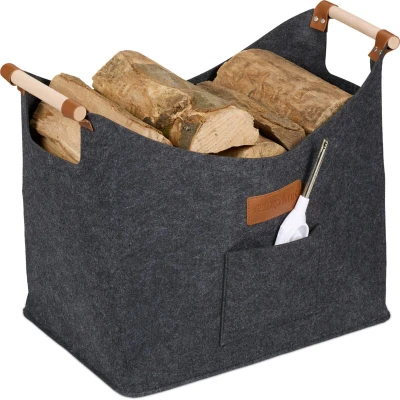 General description With the Relaxdays Felt Log Basket, you can store firewood reliably and stylishly. This robust felt bag not only fits perfectly into your living room but also offers ample space for various items such as magazines, toys, laundry, or shopping. The handy carrying handles made of natural pine wood make it easy to transport. Technical specifications Overall dimensions (H x W x D): 40 x 51 x 32 cm Capacity: 50 litres Outer pocket dimensions (H x W): 13 x 16.5 cm Handles dimensions (W x D): 20 x 2 cm Load capacity: 20 kg Weight: 1.2 kg Material: Felt, pine wood, PU imitation leather Colour: Grey, natural, brown Other information Sturdy felt log basket, ideal for storing firewood Can be folded to save space when not in use Suitable for indoor and outdoor use Includes a practical outer pocket for lighter, etc.