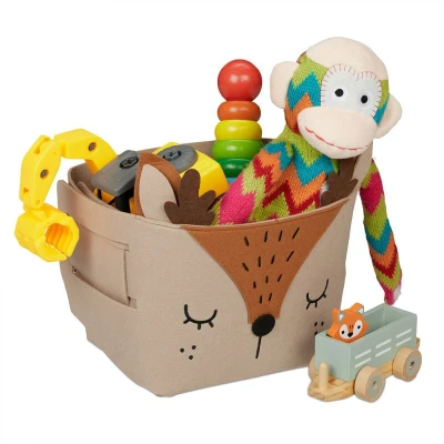 General description This cute play basket makes tidying up easier for children, allowing them to neatly store toys such as building blocks and soft toys. Its pleasantly soft surface makes it ideal for use in children's or baby's rooms. The basket can be folded flat for space-saving storage when not in use. Equipped with handles, it is easy to carry. Technical specifications Dimensions (H x W x D): 24 x 27 x 18 cm Interior dimensions (H x W x D): 18 x 24 x 17 cm Max. load: 4 kg Weight: approx. 100 g Material: felt Other information Various animal designs available. Included in delivery: 1x children's room storage basket (decorative items not included).