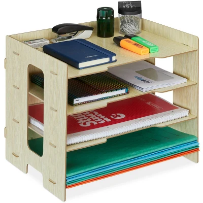 With this practical filing system, you can keep your workplace tidy. You can store notes, documents and papers up to A4 size in the 3 large compartments and the top shelf. The document holder is your ideal helper in the office or at home in the home office. Thanks to the openings on the sides, you can quickly transport the lightweight organiser made of MDF. You can simply wipe off dust and minor dirt with a damp cloth. Letter Tray in Detail - Overall dimensions H x W x D: approx. 27 x 32.5 x 25 cm - Internal dimensions of upper shelf H x W x D: approx. 2.5 x 31.5 x 24 cm - Interior dimensions per compartment H x W x D: approx. 7 x 31.5 x 24 cm - Weight: approx. 1.2 kg - Material: MDF - Available in various colours Practical Filing System for Tidiness on the Desk - Office organiser for letters, documents or notes up to A4 size - An eye-catcher on the desk in the office or home office - Recessed grips at the front for easy pulling out of papers - Side recesses for easy transport of the