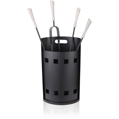 A crackling fireplace provides warmth and cosiness on cold days. With this elegant tool set, the fire stays lit for longer and the fireplace remains clean. The tools are always within reach and neatly stored in the semi-circular bucket. Made from sturdy wrought iron with elegant silver-coloured handles, the set impresses with its stability, durability, and straightforward design. Fireplace tools in detail - Overall dimensions H x W x D: approx. 63 x 25 x 15 cm - Bucket dimensions H x D: approx. 45.5 x 25 x 15 cm - Total weight of set: approx. 3.5 kg - Material: iron, nickel - Colour: black, silver Tool set in bucket - Length of poker: approx. 61 cm - Length of ash shovel: approx. 61 cm - Length of ash brush: approx. 61 cm - Length of tongs: approx. 61 cm 5-piece fireplace accessory set - Keep your tools conveniently in reach within a stable bucket - Modern design in black with nickel-plated handles - Includes ash shovel, brush, poker, and tongs - Fireproof tools made of sturdy wrought