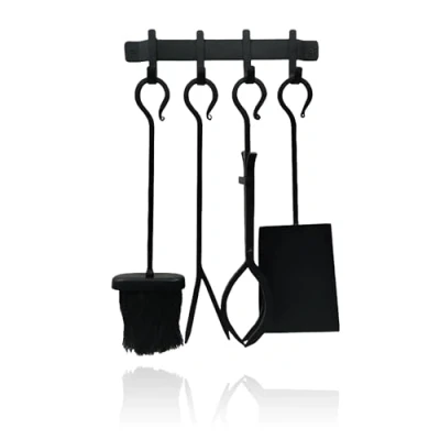 AmazonAccessories: Fireplace tool set with ash broom, shovel, fire poker, and tongs for the living room Safety: Fire poker for safely stoking the flames – tongs for adding logs Clean: Ash shovel and brush for quick and easy cleanup – perfect for fireplaces and stoves Design: Black fire accessory set in antique style - includes wall holder for easy hanging Details: Durable wrought iron fire tools – dimensions of set (HxWxD): approx. 45 x 30 x 10.5 cm