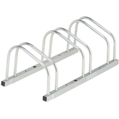 AmazonPractical: Bicycle holder for secure storage of bicycles - Incl. mounting materials for floor Multiple bike rack: This parking stand has space for 3 bicycles - For mountain bikes, e-bikes etc. Robust: The silver bike stand is made from galvanised steel - Weatherproof material for outdoors For the floor: Bike rack for garage, cellar or hallway - Can also be used outdoors Basics: Floor bike rack H x W x D: 26 x 70.5 x 33.5 cm - For wheel width of max. 50 mm