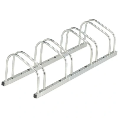 AmazonPractical: Bicycle holder for secure storage of bicycles - Incl. mounting materials for floor Multiple bike rack: This parking stand has space for 4 bicycles - For mountain bikes, e-bikes etc. Robust: The silver bike stand is made from galvanised steel - Weatherproof material for outdoors For the floor: Bike rack for garage, cellar or hallway - Can also be used outdoors Basics: Floor bike rack H x W x D: 26 x 103 x 33.5 cm - For wheel width of max. 50 mm