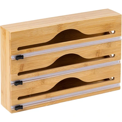 Amazon3 rolls: dispenser for sandwich paper, cling film, and foil - HxWxD: approx. 22 x 33.5 x 7 cm Practical: aluminium foil dispenser for drawer storage – keeps foil readily accessible at all times Simple: Foil dispenser with sliding cutter – clean cuts and safe use Material: Cling film dispenser made from sturdy bamboo – adds a natural charm to your kitchen Simple: foil dispenser with open side for easy loading - For roll widths up to 30 cm max.