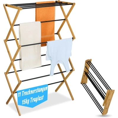 AmazonDesign: Clothes horse with bamboo frame and black metal lines - For drying your laundry Spacious: freestanding airer with 11 rods on 6 levels – for optimal space use and airflow Foldable: Easily fold the drying rack flat for storage when not in use Space-saving: this compact tower dryer is perfect for small spaces or camping. Details: Drying rack dimensions H x W x D: 115 x 73 x 33 cm - Folded H x W x D: 51 x 73 x 11 cm
