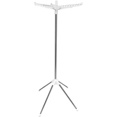 General description This practical laundry rack is ideal for hanging clothes hangers. Whether you want to hang your jumpers, T-shirts, and dresses to dry or need a place for your blouses and shirts while ironing, this compact laundry rack with its three arms offers ample space. Clothes hangers fit securely in the 27 holes of the rack without slipping. When the standing dryer is not in use, it can be easily folded and stored to save space. Technical specifications Dimensions when unfolded (H x D): 143 x 56 cm Folded dimensions (H x D): 182 x 15 cm Load capacity: 15 kg Weight: 1.1 kg Material: plastic, stainless steel Other information 3-arm laundry rack with space for a total of 27 hangers Sturdy design with 4 feet for maximum load capacity Easy to transport due to its lightweight design Compact dryer suitable for balconies and small living spaces Included in delivery: 1x laundry rack (decorative items not included)