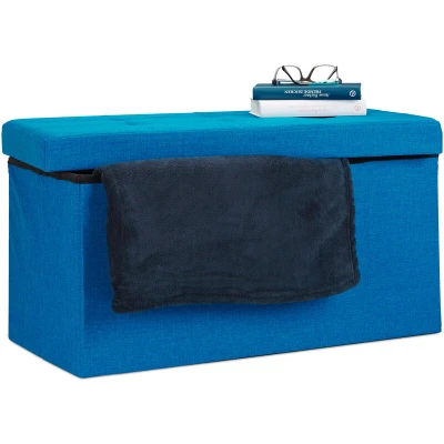 Relaxdays Folding Ottoman Storage Bench XL 38 x 76 cm Sturdy Foldable Foot Stool Box with Removable Lid, Blue