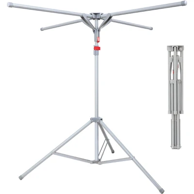 This practical laundry rack is ideal for hanging clothes on hangers. Whether you want to hang your jumpers, T‑shirts and dresses to dry or need a place for blouses and shirts while ironing, this compact rack with four arms offers plenty of space. Other items can also be spread out to dry. When not in use the freestanding airer folds flat for space‑saving storage. Laundry rack in detail - Dimensions when unfolded H x D: approx. 100–180 x 125 cm - Folded dimensions H x D: approx. 110 x 10 cm - Load capacity: approx. 15 kg - Weight: approx. 2.3 kg - Material: steel, plastic - Available in various colours Folding clothes rack with 4 arms - 4 wings provide space for hangers and large items of laundry - Ideal freestanding dryer for shirts, dresses, jumpers, T‑shirts and more - Stable airer on 3 legs for maximum load capacity - Lightweight and easy to transport – suitable for camping - Compact for balconies and small living spaces - Folds away easily when not in use Delivery contents - 1x