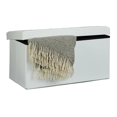 Relaxdays Folding Storage Bench Large Seat, Faux Leather, 38 x 78 cm, Foldable Footstool Ottoman with Removable Lid, White