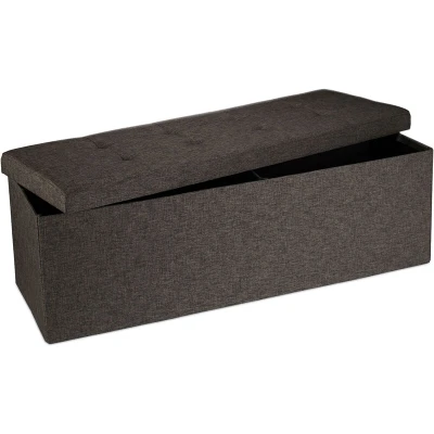 Trendy ottoman bench made of robust linen - The chic and functional design fits in anywhere: in the living room, children's room, guest room, hallway, etc. - In brown Organise your spaces - The footstool provides up to 140 L of storage room for newspapers, toys, blankets, pillows, yarn, etc. - Simply remove the lid and neatly store your belongings Sturdy seat for children and adults - Perfect for having visitors over - The bench is robust with a reliable MDF plate for stability - Supports a maximum of 300 kg The soft padding of the seat makes for a comfortable sitting surface, even for extended periods of time - The fabric is both long-lasting and weather-resistant The ottoman can be quickly folded together and stored when not in use to save space - Size assembled: approx 38 x 114 x 38 cm (15 x 44.9 x 15 in) - Size folded: approx 6 x 114 x 38 cm (2.4 x 44.9 x 15 in) - Ideal for homes with a shortage of space