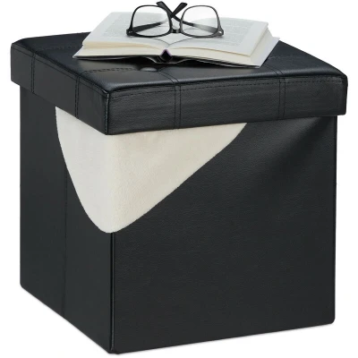 Relaxdays Footstool with Storage Space, Folding Stool Seat, 40 L, Padded, HxWxD: 38 x 37 cm, Faux Leather, Black, Fibreboard