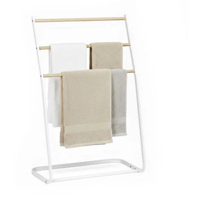 AmazonModern: White metal towel rail – 3 wood-look rungs – Curved design Smart: Staggered bars ensure good air circulation. Versatile: Ideal as a towel stand in bathroom or clothes ladder in bedroom Compact: The freestanding towel rack is space-saving and can be placed anywhere. Basics: Dimensions HxWxD: approx. 86 x 58 x 30 cm - Load per rung: max. 2 kg - Quick to assemble