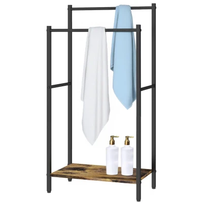 Relaxdays freestanding towel rack with shelf, HxWxD: 81.5x42x24 cm, industrial, 2 bars, wood effect/black