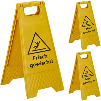 AmazonWarning: Warn passers-by of slipping risk with a 3-piece folding sign set on freshly mopped floors. Practical: Wet-floor warning sign labelled both sides – visible from every direction Usage: Warning sign for slippery floors – ideal for apartment blocks, offices, shops and more. Compact: Practical fold-out warning sign - folds flat for space-saving storage Details: Yellow plastic warning sign with 'Freshly mopped' print - HxWxD: approx 59x29x23 cm