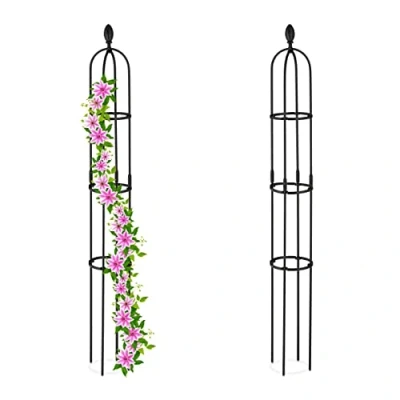 AmazonIn a set: Set of 2 round obelisks - Frames provide support for flowers and climbing plants Basics: Black plant support, steel and plastic - H x Diam.: approx. 160 x 20 cm - 3 adjustable rings Decorative: These trellises make a great way to display your plants - Eye-catching antique look Versatile: The tall obelisks are perfect for blooming roses, ivy, clematis, vegetables etc. Free-standing: Rose support can be placed on the lawn, in a flower bed or in pots on the balcony