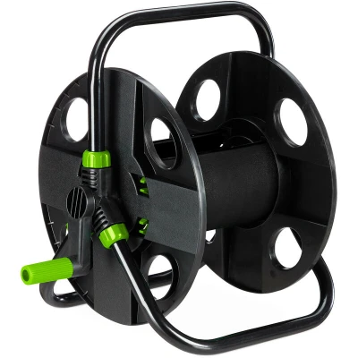 AmazonManual: Practical hose reel with hand crank for winding up 30 m 1/2 inch water hose without kinking Simple: Connection with practical click plug - Quick and secure connection of tap and hose Mobile: Standing hose holder with handle - Can be stowed away to save space when not in use Stable: Hose winder with hand crank stands securely even during casting thanks to triangular design Details: Hose reel made of plastic and steel - HxWxD: approx. 38 x 42 x 31 cm - Hose is not included