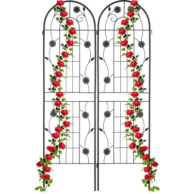 General description These trellis panels come in a set of 2, providing essential support for climbing plants while enhancing the aesthetic appeal of your garden. Ideal for ivy, roses, or clematis, these beautiful metal trellises can be arranged together in a row or placed separately throughout your garden. Technical specifications Dimensions per component: H x W x D: approx. 180 x 50 x 1.5 cm Width (including hinge): approx. 52 cm Width with panels joined together: approx. 101.5 cm Weight: approx. 2 kg each Material: Iron Colour: Black Installation Set-up is simple: connect the panels of each trellis via the hinges to join them together. Push the ground stakes into the soil for stability. Usage Perfect for supporting climbing plants in your garden. Can be used as a decorative privacy screen. Robust and weatherproof thanks to powder-coating. Other information Included in delivery: 2 x metal trellis to be assembled. Decorative items are not included in delivery.