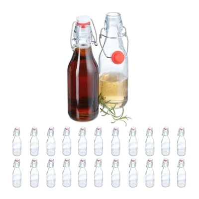 AmazonIn a set: 24x glass bottles with swing tops - Volume: approx. 250 ml - Size H x D: approx. 20 x 6 cm Airtight: Bottles with stopper and clip top - no spills of your precious homemade liqueurs Made of glass: Small refillable glass jars crafted from premium glass - odour and taste neutral Versatile: Bottles for filling with homemade liqueurs, schnapps, vinegar and herb oils As a gift: Filled bottles make a creative present for birthdays, weddings, anniversaries and more