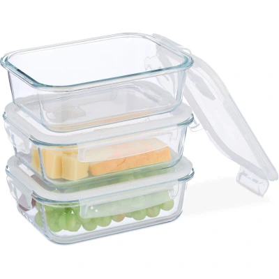 AmazonKitchen accessories: Glass storage containers in a set of 3 - each with a volume of approx. 1040 ml Airtight: Practical storage boxes with plastic lid and silicone ring - Food stays fresh for longer Universal: Suitable as a sausage box in the fridge, casserole dish (without lid), freezer, and more Practical: Durable glass containers are easy to clean - Dishwasher-safe - Stackable boxes save space Details: Heat-resistant glass containers up to 400 °C - Freezer-safe storage boxes down to -15 °C