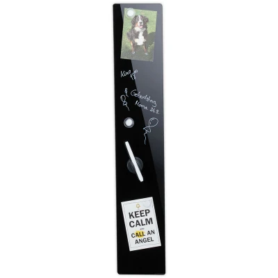General description This magnetic memo holder is an ideal companion for organizing and planning tasks. Its modern design eliminates unnecessary framing and features an elegant black finish. The board is versatile, allowing for horizontal or vertical mounting, and includes 3 magnets, a marker, and a magnetic pen holder for convenience. Technical specifications Dimensions: 15 x 80 cm Weight: 1.5 kg Depth of glass: approx. 4 mm Material: Glass, metal Color: Black Installation Can be mounted horizontally or vertically Includes 4 holes for mounting Mounting materials (plugs and screws) are included Usage Can be written on with the included marker Magnetic surface allows for attaching photos and notes Easy to clean using the back of the pen holder Other information Included in delivery: 1 x Magnetic Glass Memo Board in Black, 1 x Marker Pen, 1 x Pen Holder, 3 x Magnets Decorative items shown in product photos are not included For additional magnets, it is recommended to use strong ones