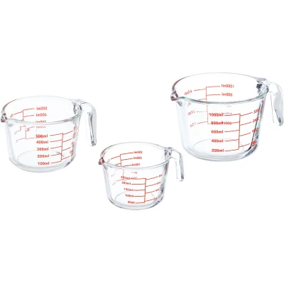 AmazonSet: 3 measuring jugs made from heat resistant borosilicate glass - 250 ml, 500 ml and 1 L volume Kitchen tools: Jugs for precise measurements of liquids and other ingredients for cooking and baking With measurements: Glass cups with 3 units of measurements - Millimetres, ounces & American cups Heat resistant: Can be used to heat up ingredients in the oven, on the hob or in the microwave Practical: Easy to clean glass holders, dishwasher safe - With handle and drip-proof spout