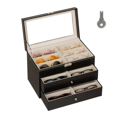Capacity: Practical glasses case for securely storing 18 pairs of glasses or sunglasses Design: Glasses organiser in leather effect with silver clasp - Elegant design in black colour Protection: Durable glasses case with soft, cream velvet lining - Shields glasses from scratches Display: Glasses case with glass window for elegant presentation of your eyewear collection Detail: Dimensions glasses rack HxWxD: approx. 22.5 x 33.5 x 19 cm - Lockable glasses box with key