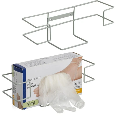 General description With these glove dispensers in a set of 2, you always have gloves on hand. Each holder can accommodate one disposable glove box, making them versatile for various settings such as medical clinics, doctors' practices, kitchens, and bathrooms. The open wire frame made of sturdy iron allows for easy filling and effortless glove removal. Technical specifications Dimensions (H x W x D): 9.5 x 28 x 9.5 cm Internal dimensions (H x W x D): 9 x 27 x 8 cm Opening width: 18.5 cm Weight: 130 g each Material: Iron Colour: Grey Compatibility and accessories Compatible with standard disposable glove boxes Includes mounting hardware for simple wall installation Usage Ideal for use in doctors' surgeries, laboratories, bathrooms, kitchens, etc. Helps maintain order, is hygienic, and easy to clean Gloves can be easily accessed from the glove holder