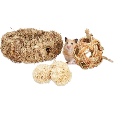 General description You can create a great enclosure with varied possibilities for playing, nibbling, and hiding for hamsters or mice with this small animal accessory set. The rodents can perfectly explore the round tunnel thanks to several entrances and exits or retreat into the tube to sleep. The small grass nest also offers a comfortable retreat. The 3 balls can be used as cage decoration or for playing and can be easily hung up in the cage with the loops. Technical specifications 3x small ball: Diameter approx. 5 cm / loop approx. 7 cm / weight approx. 10 g Large ball: Diameter approx. 9 cm / loop approx. 32 cm / weight approx. 20 g Tube: Height x Diameter approx. 6.5 x 18 cm / weight approx. 120 g Material: straw, sea grass, rattan Colour: natural Included in Delivery 3x small ball 1x hay ball 1x hay tube Decorative items are not included in the scope of delivery