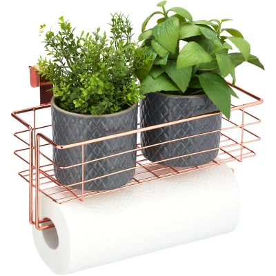 AmazonStorage: Copper metal basket to hang in the kitchen - Ideal as an organiser and spice rack 2 in 1: Practical combination of kitchen roll holder and basket - Space-saving solution for utensils Hanging: Simply hang up the metal basket - Suitable for cupboard door, kitchen railing, radiator Kitchen dispenser: Pole suitable for kitchen paper roll, towels and cleaning cloths - WxD: 2 x 31 cm Variable: Also useful in the bathroom for cosmetics - Basket dimensions HxWxD: 8 x 31 x 13.5 cm