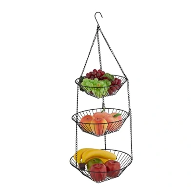Practical: Open hanging storage with 3 shelves - For airy storage of crunchy fruit and vegetables Hanging: Fruit bowl for space-saving mounting on the cupboard - Ideal storage for small kitchens Modern: Round fruit hanging bowls made of black steel - Decorative basket in stylish lattice design Flexible: If necessary, the chains can be removed - Fruit holders can also be used separately Details: Overall HxØ: 73 x 28 cm, Large bowl Ø: 28 cm, Medium bowl Ø: 25.5 cm, Small bowl Ø: 22.5 cm