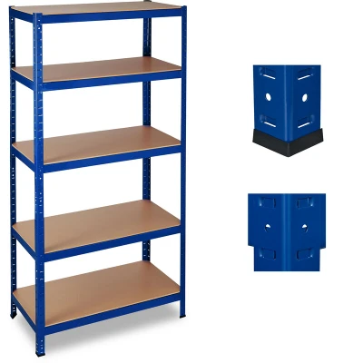 General description The Relaxdays Heavy Duty Shelf is designed to provide ample storage space for heavier items, making it ideal for use in workshops, garages, pantries, cellars, sheds, stockrooms, and mud rooms. With adjustable shelves, this modular rack can be customized to meet your specific storage needs. It can also be divided into two separate units, allowing the top shelves to be used as worktops. Technical specifications Dimensions (H x W x D): 180 x 90 x 45 cm Weight: approx. 23.5 kg Capacity: approx. 1325 kg Capacity per tier: approx. 265 kg MDF shelf dimensions (W x D): 89 x 44 cm Material: 6.8 mm MDF shelves, 1.2 mm metal, plastic Color: Blue, brown Installation Assembly is quick and easy with a practical interlocking plug-in system that requires no hardware. A rubber hammer is needed for assembly. Gloves are recommended for assembly. A screwdriver may be necessary to lightly bend the prongs in some cases. Usage Store tyres, machines, tools, canned goods, and other heavy