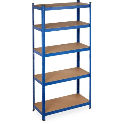 General description The Relaxdays Heavy Duty Shelving Unit is designed to provide ample storage space for heavier items in various settings such as workshops, garages, pantries, cellars, sheds, or warehouses. With its sturdy construction and adjustable shelves, this shelving unit is ideal for organizing tools, machines, tyres, canned goods, and more. It can also be divided into two separate units if needed. Technical specifications Dimensions (H x W x D): approx. 180 x 90 x 40 cm (70.9 x 35.4 x 15.7 in.) Dimensions per shelf (W x D): approx. 89.5 x 39 cm (35.2 x 15.4 in.) Weight capacity: approx. 875 kg Weight capacity per tier: approx. 175 kg Weight: approx. 12.8 kg Material: MDF, steel, plastic Colour: Blue, brown Installation The shelving unit features a practical interlocking plug-in system that does not require screws, making assembly quick and easy. A rubber hammer is recommended for assembly. Gloves should be used during assembly for safety. A screwdriver may be necessary to