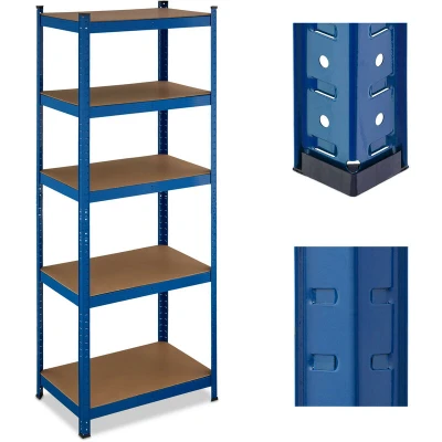 General description The Relaxdays Heavy-Duty Shelving unit provides ample space for organizing and storing heavy items. Ideal for use in cellars, workshops, garages, or garden sheds, it allows for efficient storage of tires, machines, tools, and food supplies in a space-saving manner. The robust steel construction ensures durability, while the variable height of the five shelves allows for customization according to your needs. Technical specifications Dimensions (H x W x D): approx. 180 x 70 x 45 cm Total load capacity: approx. 500 kg Load capacity per level: approx. 100 kg Dimensions per shelf (W x D): approx. 69.5 x 44 cm Thickness per MDF board: approx. 0.5 cm Weight: approx. 10.6 kg Material: Steel, MDF, plastic Color: Blue, natural Installation Assemble the shelving unit according to your requirements. A rubber mallet is recommended to join the plug-in connections. For safety, it is advised to assemble the shelving unit while wearing gloves. Usage Can be used as a storage shelf