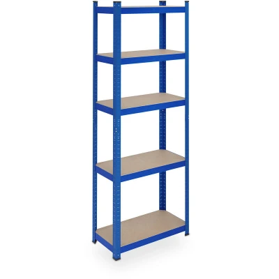 General description This heavy-duty shelving unit offers ample space to keep your items organized. Ideal for use in cellars, workshops, utility rooms, garages, or garden sheds, it provides essential storage for heavy objects such as tires, machines, tools, or food supplies in a space-saving manner. The robust steel storage rack can be customized to your needs, with adjustable shelf heights and the option to split the unit into two separate racks. Technical specifications Dimensions (H x W x D): 180 x 60 x 30 cm Max. load capacity: 500 kg Weight capacity per tier: 100 kg Size of shelves (W x D): 59 x 29 cm Thickness of each MDF panel: 4 mm Weight: 7.8 kg Material: Steel, MDF, plastic Colour: Blue Installation Assemble the shelving unit using a rubber mallet to join the plug-in connections. For safety, it is recommended to wear gloves during assembly. The unit can be easily assembled without screws or drilling. Usage Perfect for storing tools, bottles, and other items in cellars,