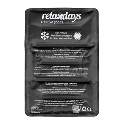AmazonFirst aid: Reusable compress with gel filling - Large hot and cold pack for back, abdomen, chest Cold use: Cooling pad for relief of acute pain - Ideal for bruises and sprains etc. Warm therapy: Heat pad can be warmed up in water bath or microwave - Perfect for back and abdomen Quality: Gel pack with thick seal to prevent leakage - Compress remains malleable up to -18 °C Details: Black gel pack H x W x D: approx. 2 x 25 x 36 cm - With instructions written on the pad