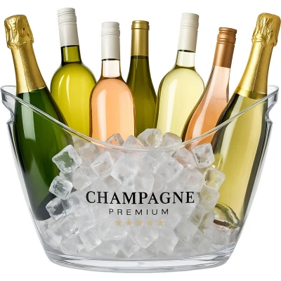 General description This compact ice bucket made of transparent plastic is perfect for cooling drinks for any occasion. The sturdy champagne bowl has space for several bottles and ice cubes, making it ideal for wine, prosecco, or champagne. The drinks cooler is waterproof, shatterproof, and versatile, ensuring reliable refreshment whether in the garden, at parties, or barbecues. Technical specifications Overall dimensions (H x W x D): approx. 25.5 x 34.5 x 25 cm Capacity: 8 l Wall thickness: approx. 6 mm Weight: approx. 1 kg Material: Plastic Colour: Transparent Other information Modern and shatterproof design made from high-quality plastic Side handles ensure secure transport, even when the cooler is full Eye-catching with stylish "Champagne Premium" lettering Quick and easy to clean