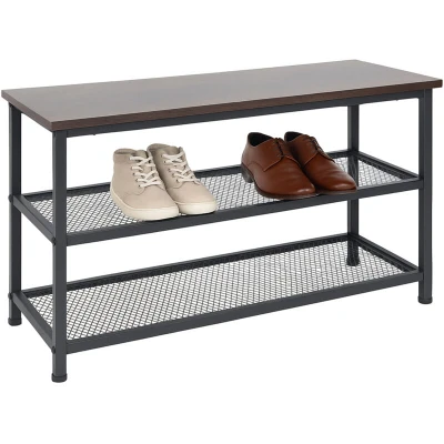 AmazonStorage space: Shoe storage for up to 6 pairs on 2 levels - Top shelf for bags, hats and more. Industrial: Black shoe rack with iron mesh shelves – top in dark walnut effect Practical: open shoe rack for quick access and a clear view of your shoe collection Stability: Durable hallway furniture made from iron, load capacity up to 65 kg - MDF shelf for bags. Details: Shoe rack dimensions HWD: approx. 45x80x30 cm - Quick assembly - Load capacity: max. 65 kg